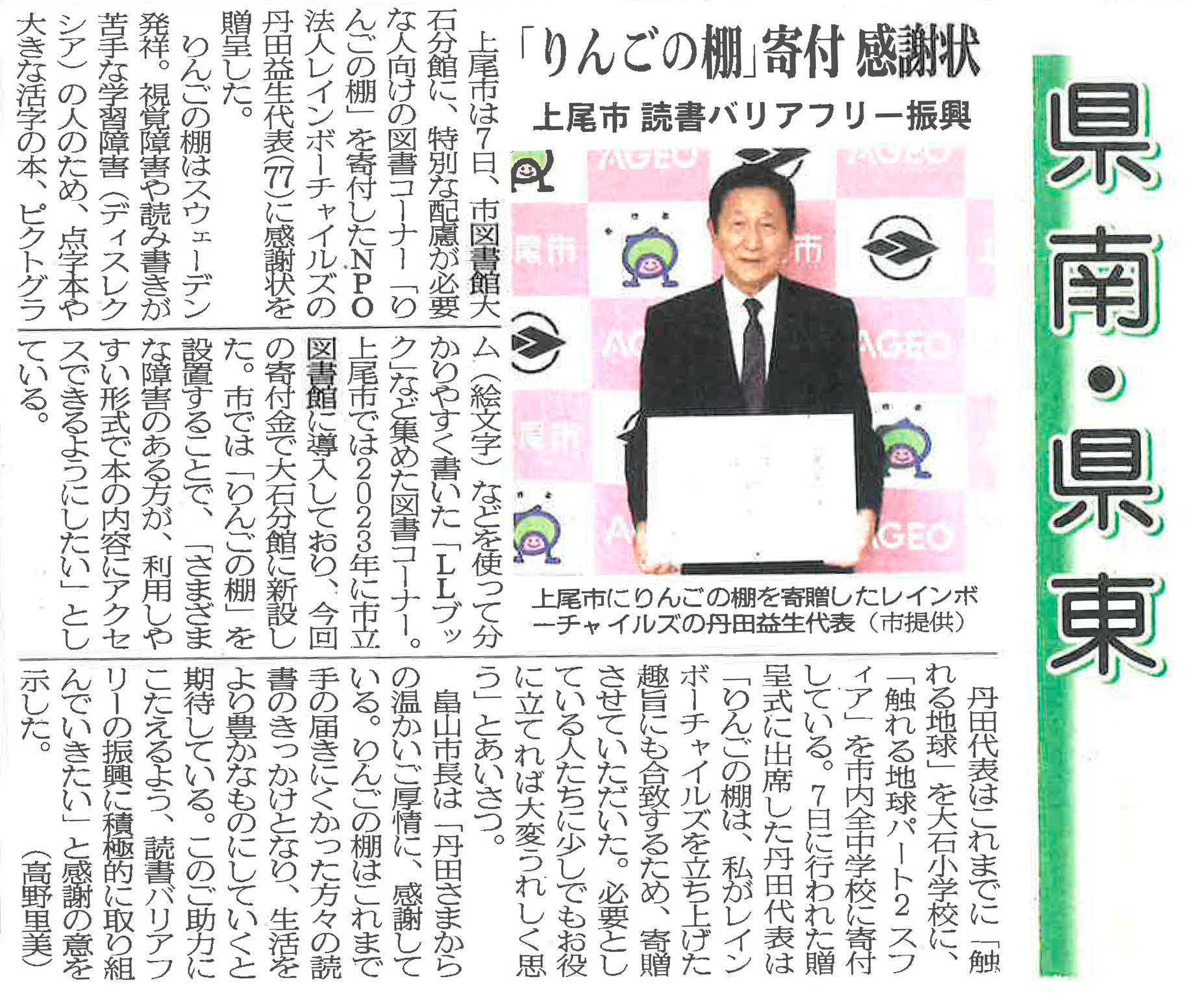 この度、当社代表取締役社長 丹田 益生はNPO法人レインボーチャイルズの代表として上尾市図書館大石分館に「りんごの棚」を寄贈させていただきました。